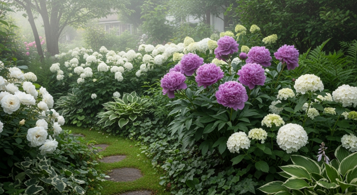 A successful focal point balances contrast and cohesion. Lavender peonies achieve this when combined with complementary plantings: